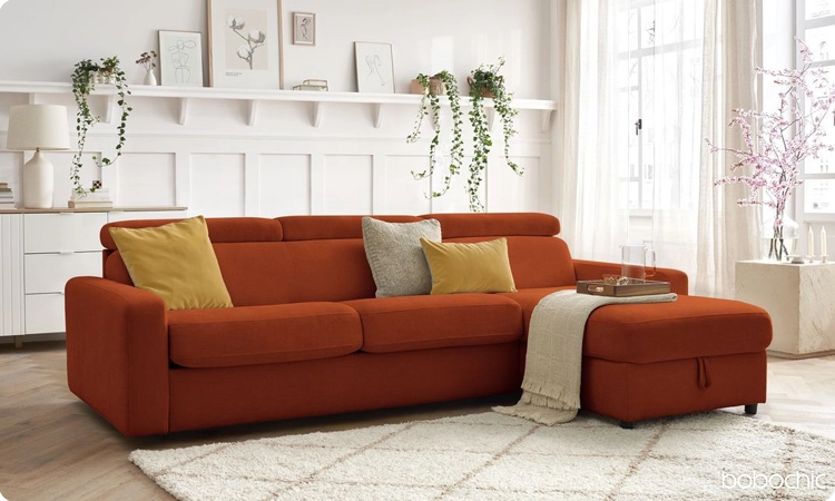 Le premier effet d’un canapé terracotta dans un salon, c’est la sensation de chaleur qu’il apporte. En effet, les tons terreux évoquent le soleil, la chaleur du sud et les paysages méditerranéens. Comme vous le savez, le terracotta repose sur des pigments rouges, orangés et bruns, des teintes chaleureuses, qui amènent une atmosphère confortable, conviviale et même intime. Alors, réchauffer l’atmosphère de votre salon moderne avec un canapé terracotta. Surtout en cette période automnale où le soleil se fait de plus en plus discret.