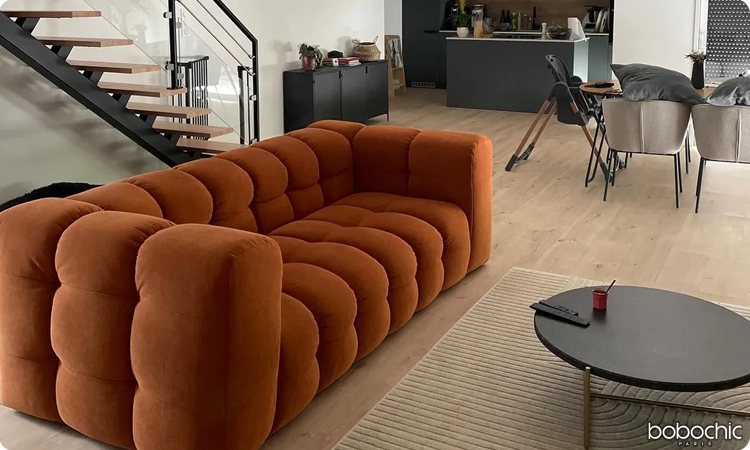Tout d’abord, le canapé terracotta se présente comme une option audacieuse, mais redoutablement efficace pour dynamiser un salon moderne. Et ce pour plusieurs raisons.